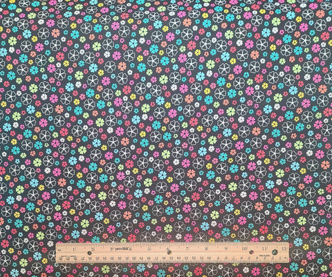 Basic 7094-13 Blue Hill Fabrics - Black Fabric / Bright Pastel Multi-Colored, White Packed Flower Print