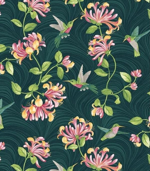 Hummingbirds and Honeysuckle by Jackie Robinson for Benartex #13213 Teal Multi - Teal Fabric / Bright Green, Pink, Gold Flower, Hummingbird