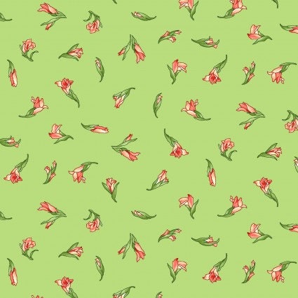 Sommersville by Maywood Studio - Little Buds - Pale Green Fabric / Scattered Dark Coral Gladiolus Buds