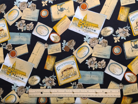 Cheryl Roy Collection for SSI - Black Fabric / Vintage Label Print