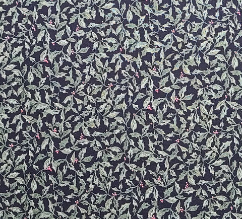 Country Holiday by Hoffman International Fabrics - Black Fabric / Green and Pink Holly Leaf and Berry Print / Gold Metallic Accents