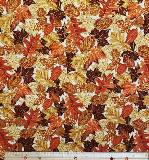 East Grove S#M7481 by Hoffman California International Fabric-Cream Fabric with Rust / Brown / Burnt Orange Leaf Print/Gold Metallic Accents