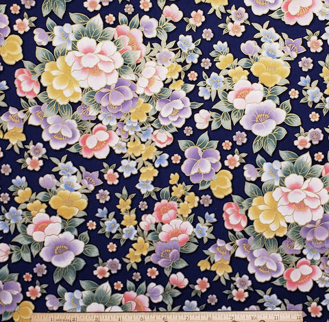 Screen Print D#6983 - Pastel Pink, Lavender, Blue, Yellow Flower Print with Gold Metallic Accents on Dark Blue Fabric