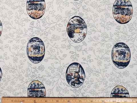 Vintage 48" WIDE Reproduction-Style Pale Gray Fabric / Floral Stamp and Wagon, Horse & Buggy, Stove Vignettes